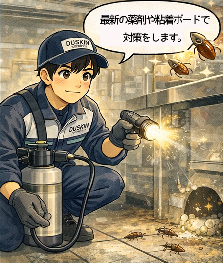 ご契約いただいている飲食店やオフィス、一般家庭を訪問し、ゴキブリ・ネズミなどの害虫獣の防除、駆除、侵入防止対策を行います。最新のシステムと薬剤を使用するため、力仕事よりも丁寧な作業が中心です。